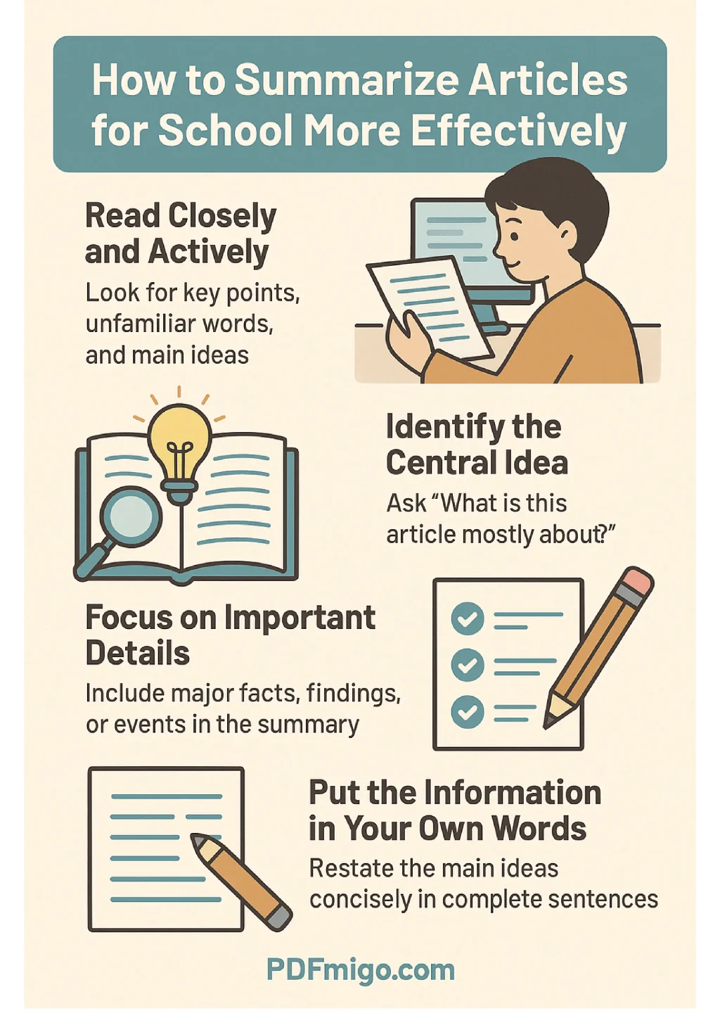 Summaries are one of the most common assignments in school. Whether you’re reading a news story, a science article, or a chapter from a textbook, teachers often ask you to “summarize the main idea.” A good summary does not copy the original text—it shows that you understand it. Summarizing also improves reading comprehension, critical thinking, and writing skills. Many students keep article notes, outlines, and summary worksheets organized using PDFmigo.com.